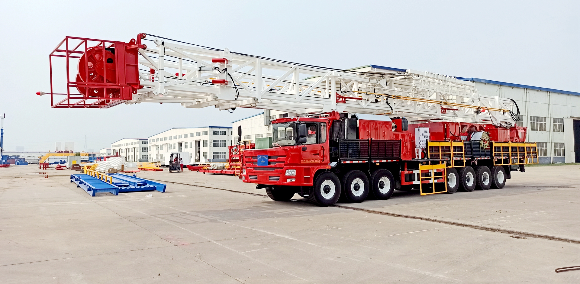 車裝鉆機(jī)是將動力系統(tǒng)、絞車、井架、游車系統(tǒng)及傳動系統(tǒng)等部件全部裝載于自走式底盤上。具有作業(yè)負(fù)荷大、性能可靠、越野能力強(qiáng)、移運(yùn)方便,作業(yè)和搬遷費(fèi)用低等特點(diǎn)。
